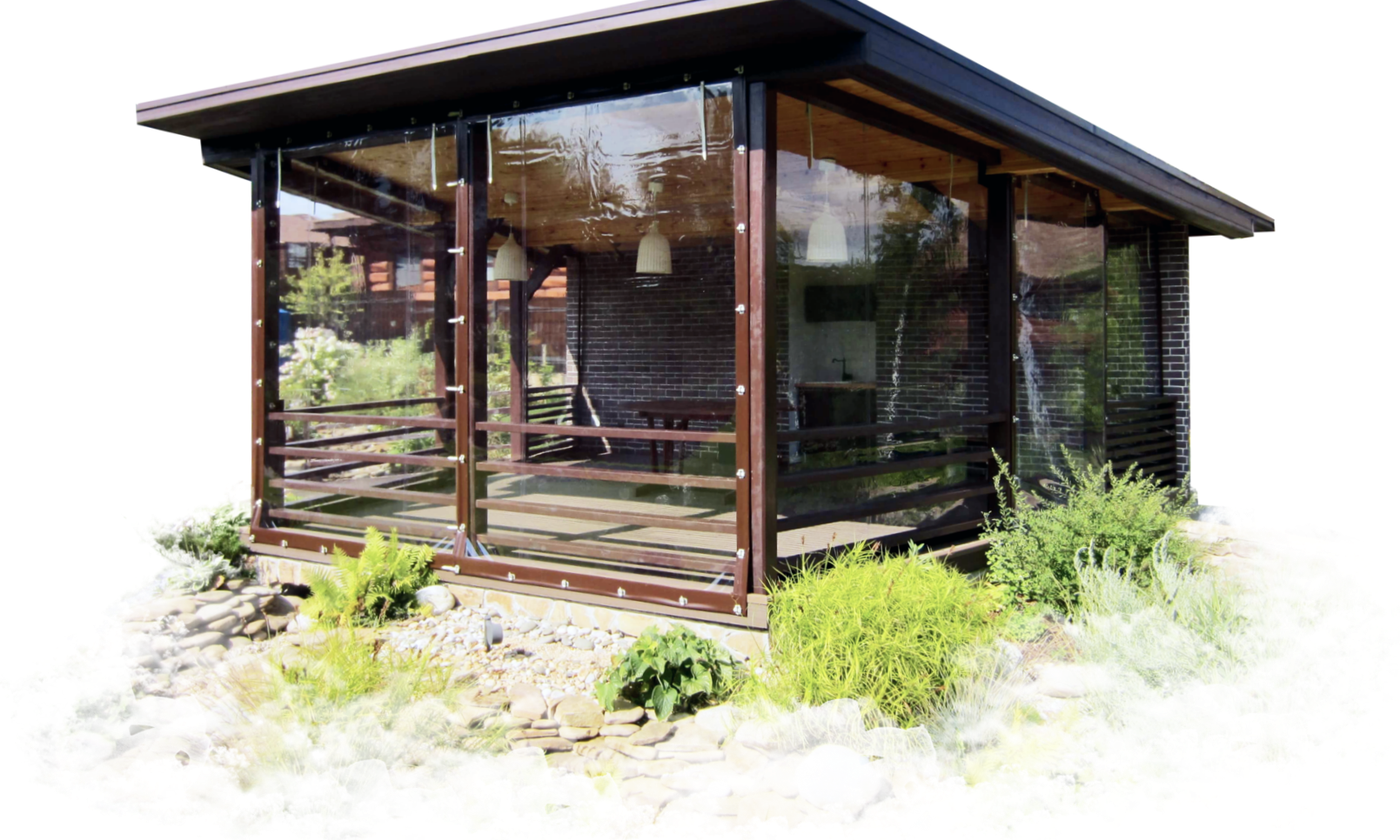 Мягкие окна – это прочная пленка из ПВХ определенной толщины, имеющая светопропускаемость около 95%. Обычно используются для защиты открытых веранд, террас, беседок от ветра и осадков. При монтаже пленка вплавляется в кант, который играет роль рамы. В хорошую погоду окна легко скручиваются в рулон и не мешают любоваться открытыми видами.